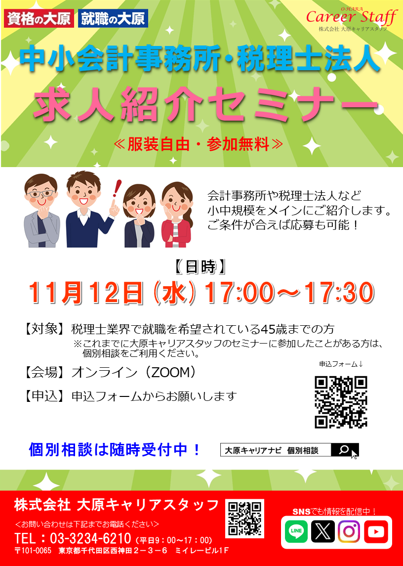 | 対象 | 税理士業界で就職を希望されている45歳までの方 ※これまでに大原キャリアスタッフのセミナーに参加したことがある方は、個別相談をご利用ください。 |