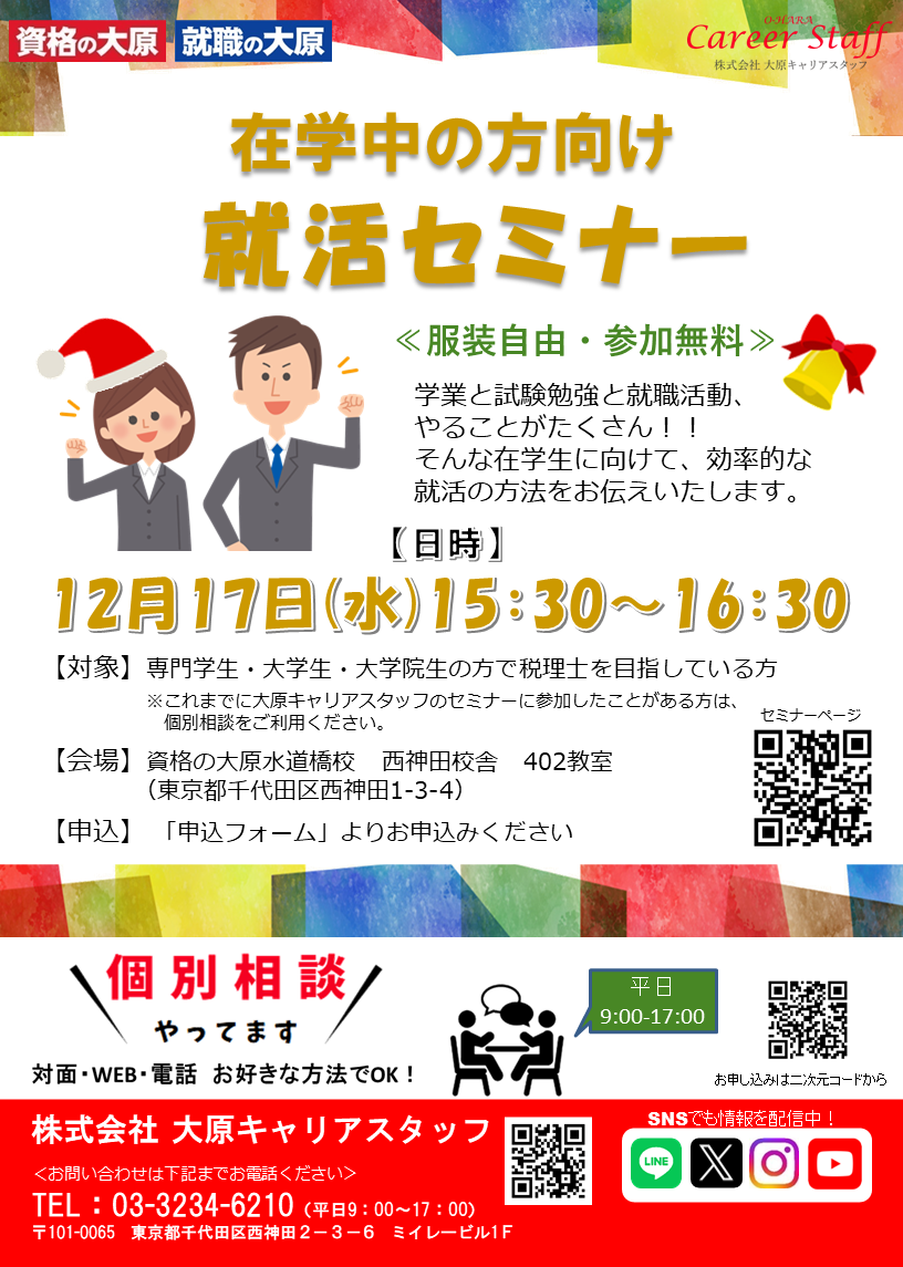 | 内容 | 11月29日(土)に開催される、税理士法人・会計事務所が集結する『就職フェア』の参加に向けた準備や攻略法などをお伝えします。 |