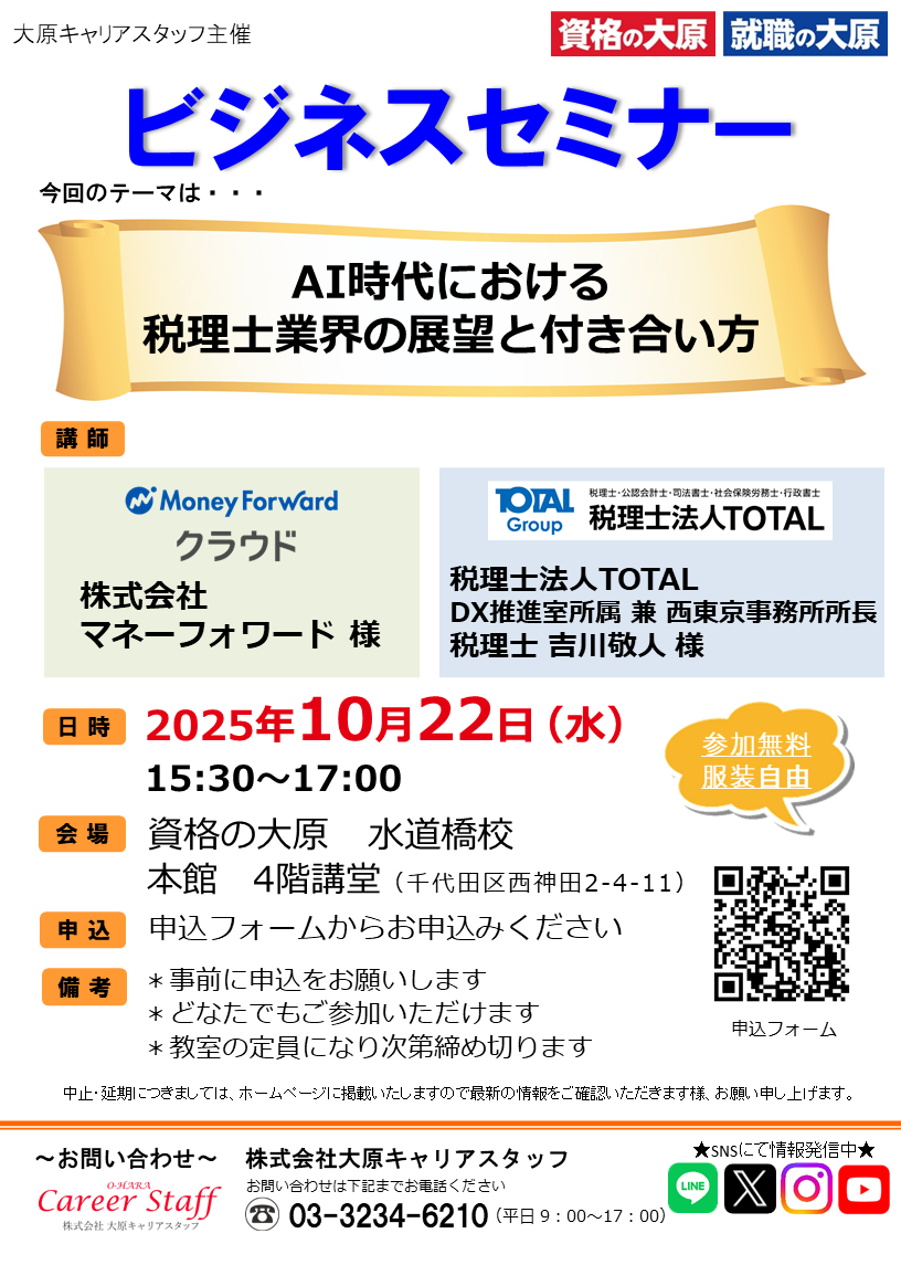 「株式会社マネーフォワード」様と「税理士法人TOTAL」様を水道橋校にお招きし、「AI時代における税理士業界の展望と付き合い方」についてお話いただきます。 就職・転職に役立つ内容となっております。是非ご参加ください。 |