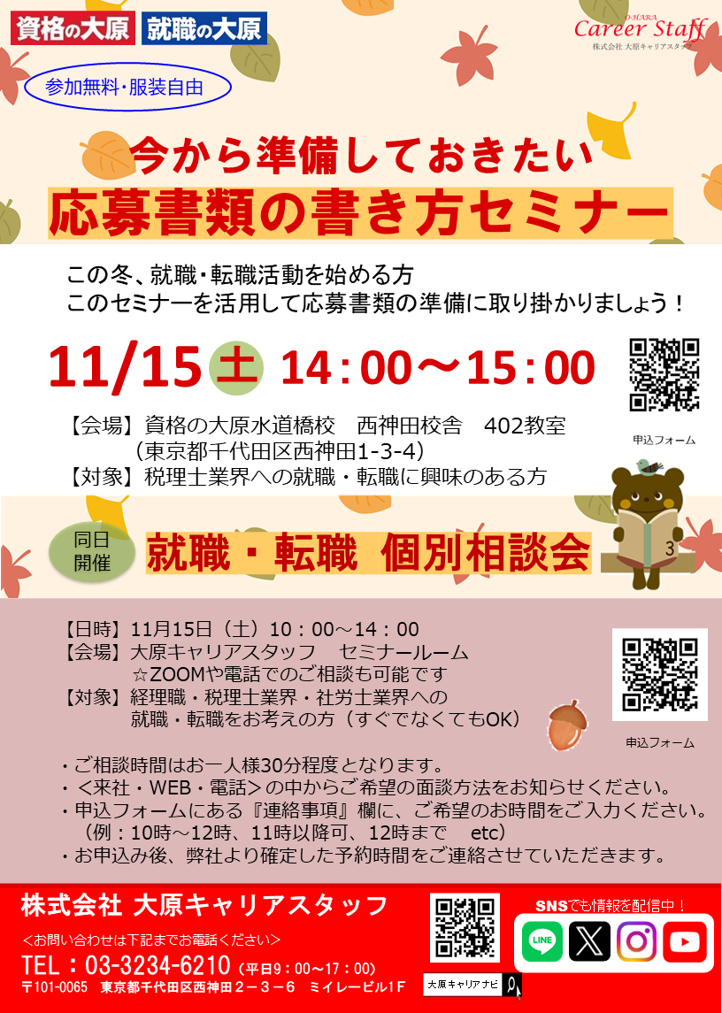 ①来社 大原キャリアスタッフ・セミナールームまでお越しください。 (東京都千代田区西神田2-3-6 ミイレービル1F) アクセスマップ:https://www.o-hara-cs.jp/accessmap.html ②オンライン<ZOOM> 参加URLをメールでお送り致します。 ③電話 当日、こちらからお電話致します。 |