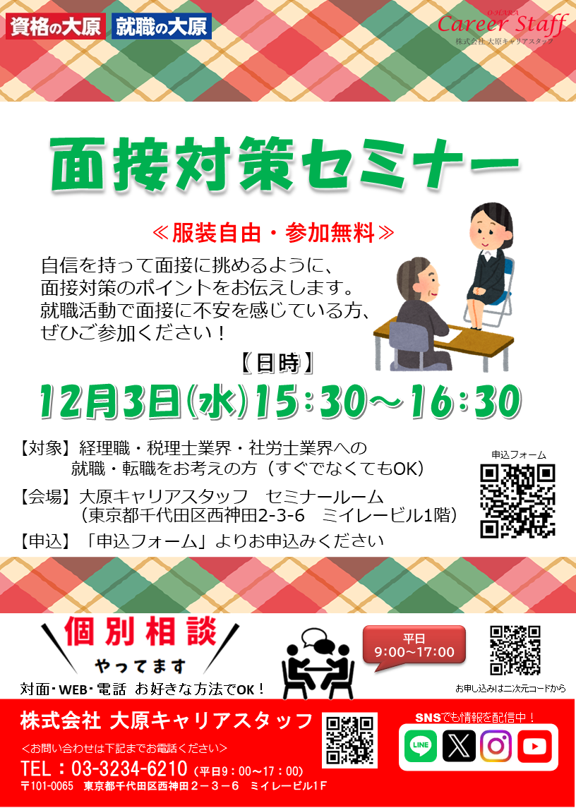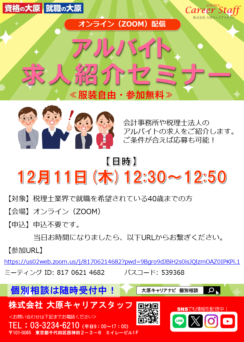 | 対象 | 経理職・税理士業界・社労士業界への就職・転職をお考えの方(すぐでなくてもOK) |